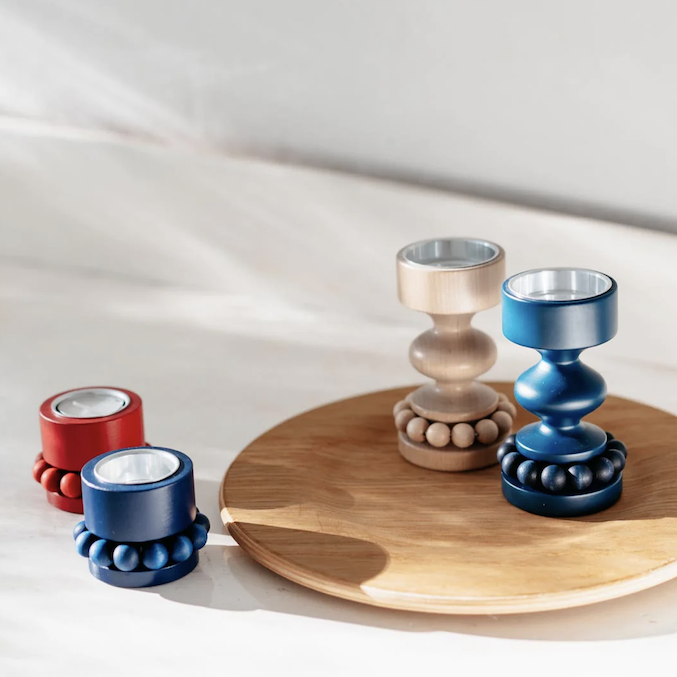 The Princess candleholder is made of wood. It comes with a single wreath made of wooden beads. Suitable for both tealights and straight candles. Available in different colors.