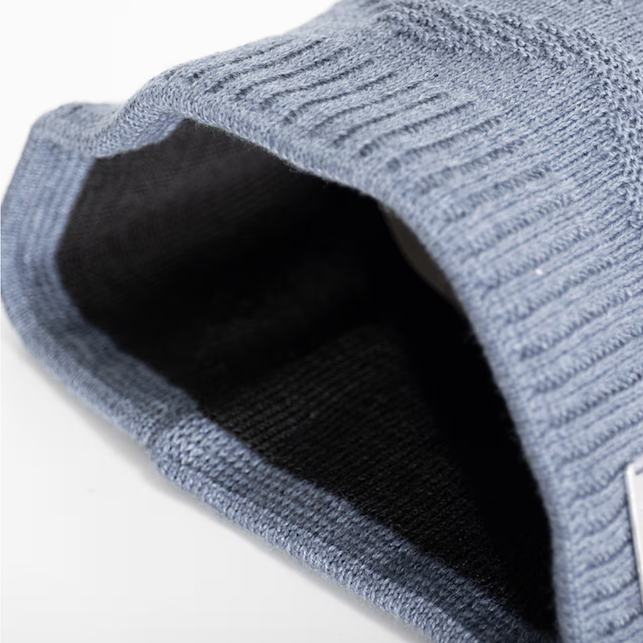 このビーニー帽には、eVent の防風膜とポリコロンのニット裏地が