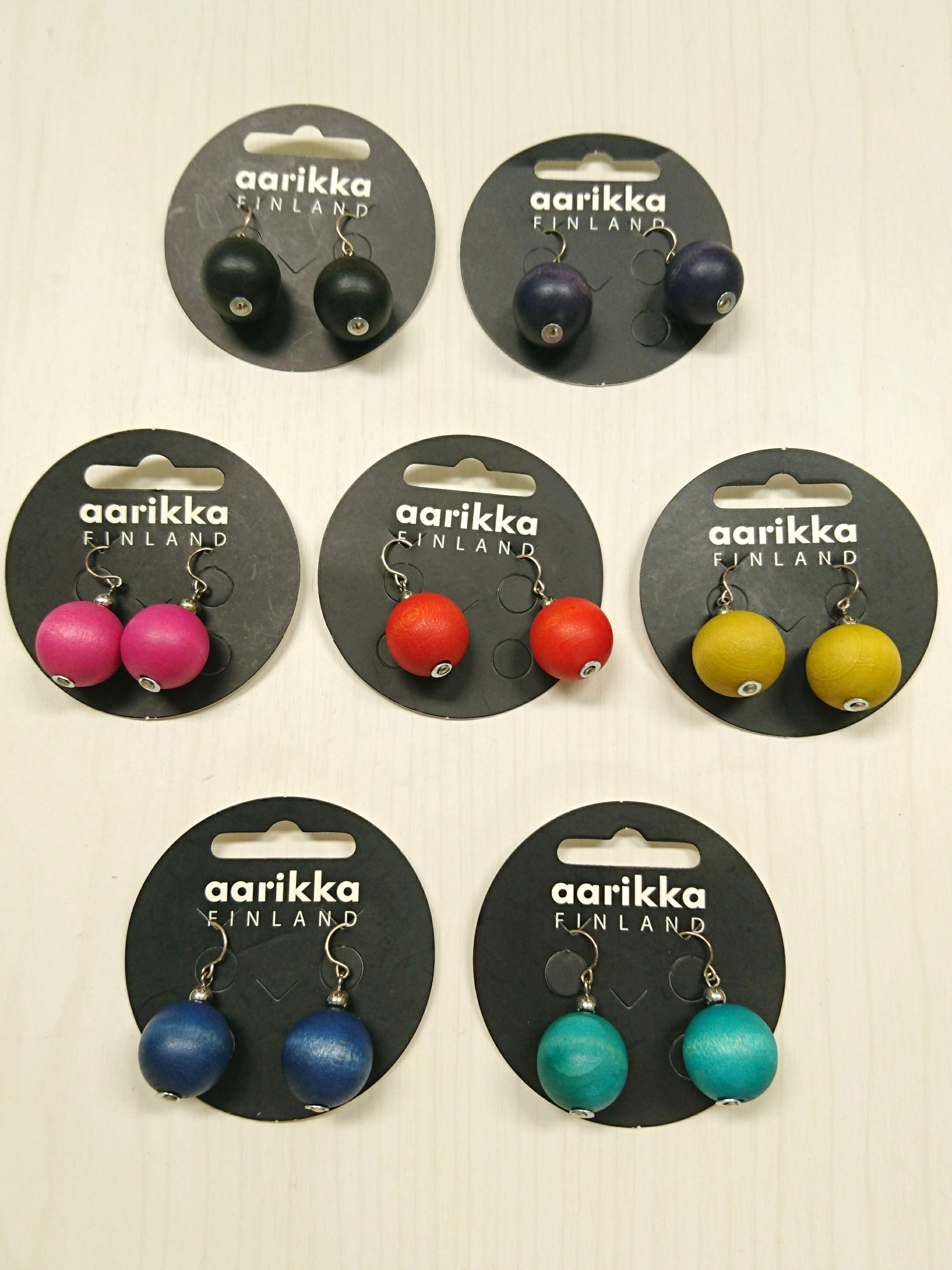 Diameter 6 cm. Nickel-free. Materials: wood and rubber string. Handmade in Finland.