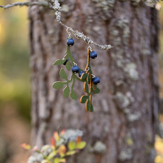 Hand-dyed Mustikka earrings consist of wooden beads and wood cut to a shape. They are light to wear and put a finishing touch to your outfit.