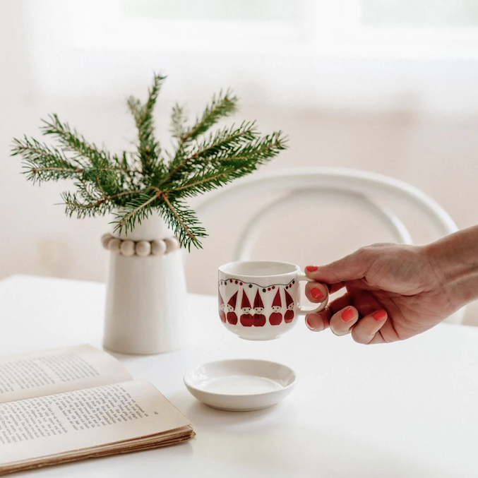 Elf-themed espresso set brings a joy to your table. Use it for coffee, tea, or mulled wine. Use the small plate for lemons, gingerbread cookies, or other treats. Together, separately. Joy to your tableware.