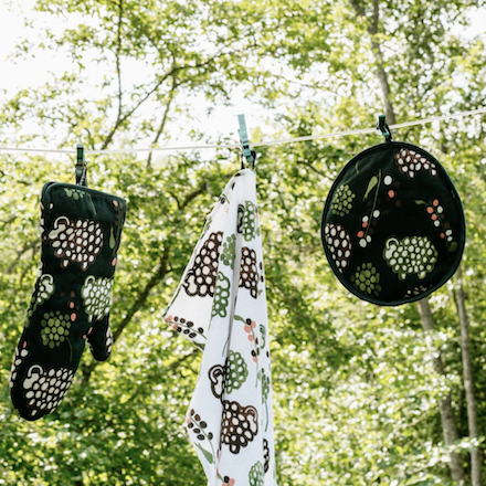 The Pässit-kedolla series celebrates the anniversary of Pässit. The cotton tea towel is rectangular in shape and has a hanging loop. Bring Aarika's timeless design home!